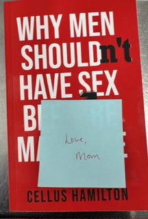 8:00am: Sarah gets to the office and says some random guy was preaching on the train about abstaining from sex before marriage. I told her don’t worry, I bought the book. She can read it when Gabe’s done.