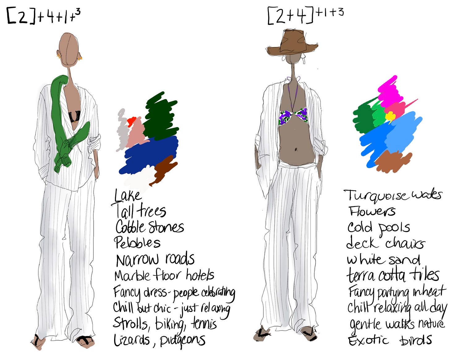 Ok, let’s start with these two locations. It’s funny, when I’m sketching I can literally feel how I’ll be in these different places. I’ve chosen two destinations that are predicated on the idea of just really relaxing. There’s water, sports, and good food involved. But the terrain and the tone wildly different. Breakfast and a day lakeside at Villa D’este, there’s a casual ease but a polish to the area. Marble floors, green lawns, and deep blue water. The core of the suitcase is the classic 2’s, and accents of color and the refinement of a chic black make it feel just right. And whilst I’m always a fan of a good “ish” of ring 3, those neutrals that tone down any brights, at Lake Como I crave a bit of “crispness.” Here on Necker Island though, the water is a bright turquoise, the birds are brightly colored, iguanas abound, and poolside you’re apt to see some flashes of gold embroidery but decidedly chill. A bright colored bikini, the open jacket as a shirt and a straw hat (a bit of cowboy vibes for me, always) make me feel like I just nailed the moment.