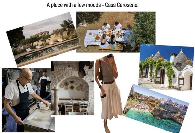 Think sandy white architecture, fields for picnics, a cow farm nearby that makes the local cheese, the most incredible dinners at Osteria del Caroseno, cobblestone streets in town and day excursions to Puglia.