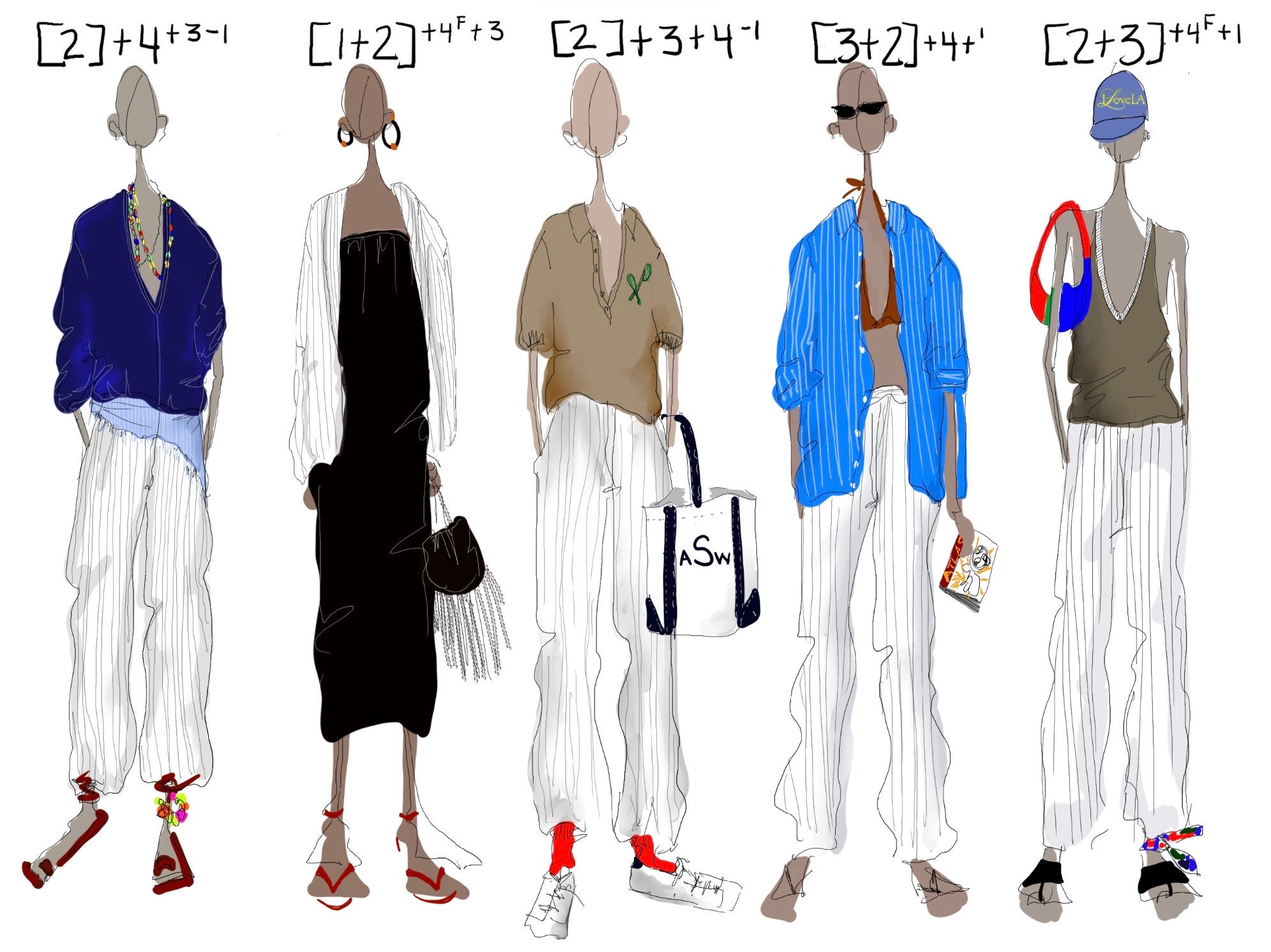 Knowing the color math of a destination helps get you in the right mindset, for what to pack, how to layer. I sucked at math in school, don’t worry, I’ve kept it all simple. The numbers in the two bracketts [ ] are the color rings that serve as the foundation for what goes in the luggage. The pluses outside the brackets are the add ons, and the smaller numbers indicate the accents. If there’s a little “f” by a number it means the accent is a “fashion friction” add-on, not a foundational. Things that give good ick.