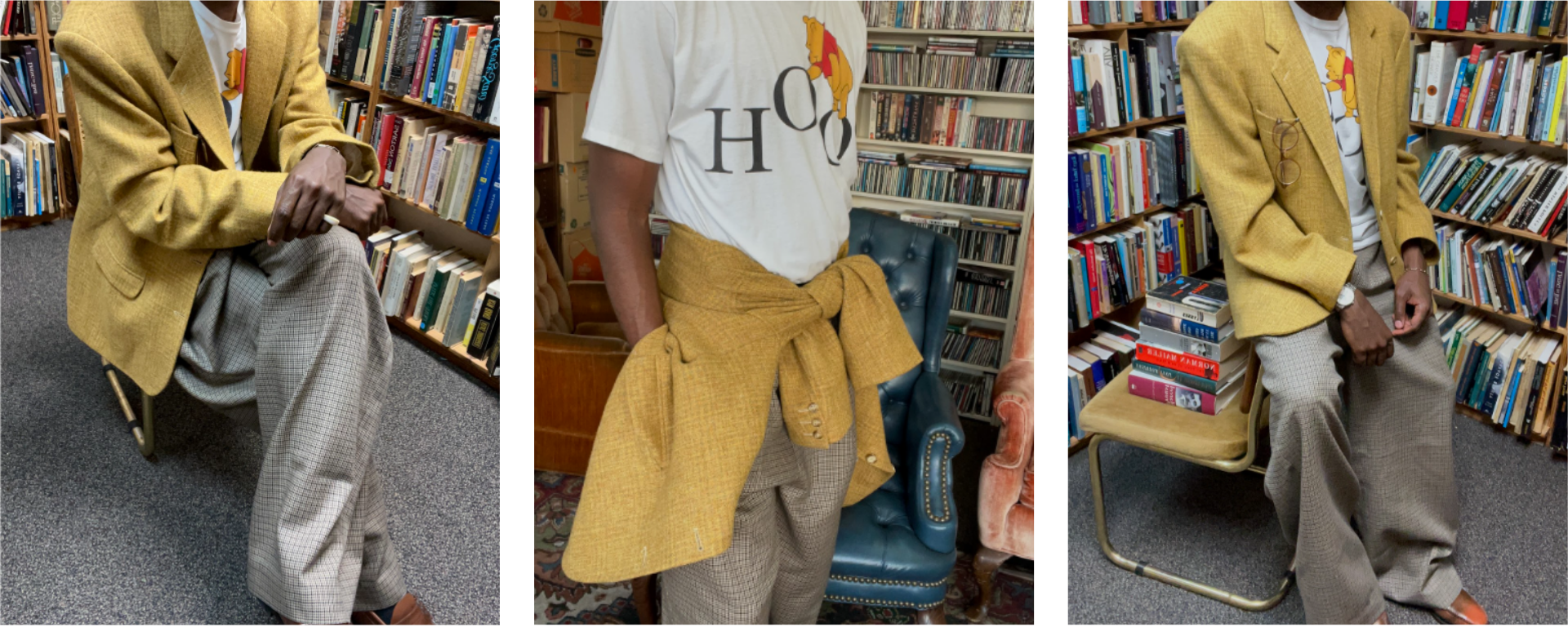 So you can see why I doubled up with the tweed mustard check blazer I thrifted in Antwerp in 2023, at a store just doors down from the Dries Van Noten flagship, Het Modepaleis. And because I keep my inner child near, and especially because irony is stimulating, you might see how a Winnie the Pooh t-shirt pulls the whole thing together and throws the whole thing off. And where did I first see a suit jacket tied around the waist? Who was that? What collection? It actually might’ve been Amy. In any case, it instantly resonated with the part of my dress philosophy that maintains we ought not be overly precious about clothes.