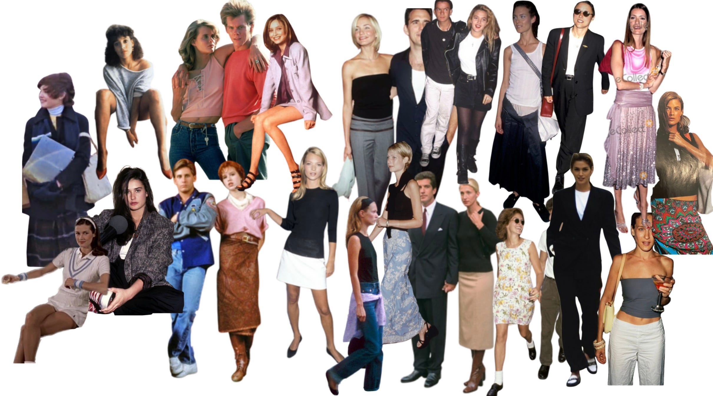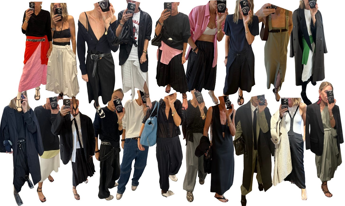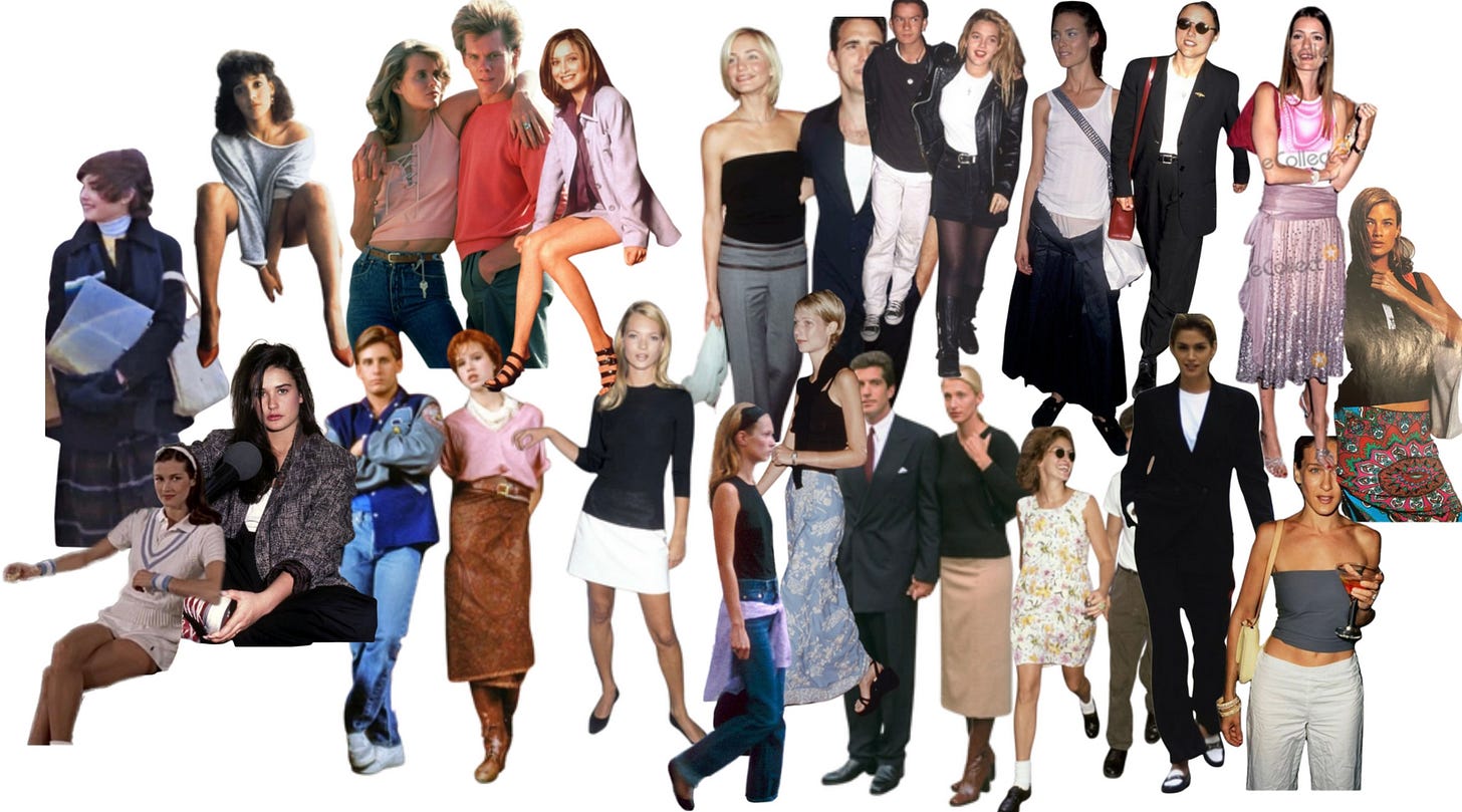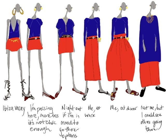 Which brings us back full circle now to the original visual. I originally set out to try and “recreate” those visuals from those narrow minded articles about dressing your age. But as I was doing it I realized, I would wear all these things today - but the BIG difference is the where and how it would be styled. I wouldn’t wear the short skirt in my office, it would convey too much of an un-seriousness for me. At least if I was having a meeting that day. And my 20 year old self would have loved the full skirt. I even had an idea to just make the 70+ person ridiculously covered up - but I realized that’s a vibe too - for the right moment.
