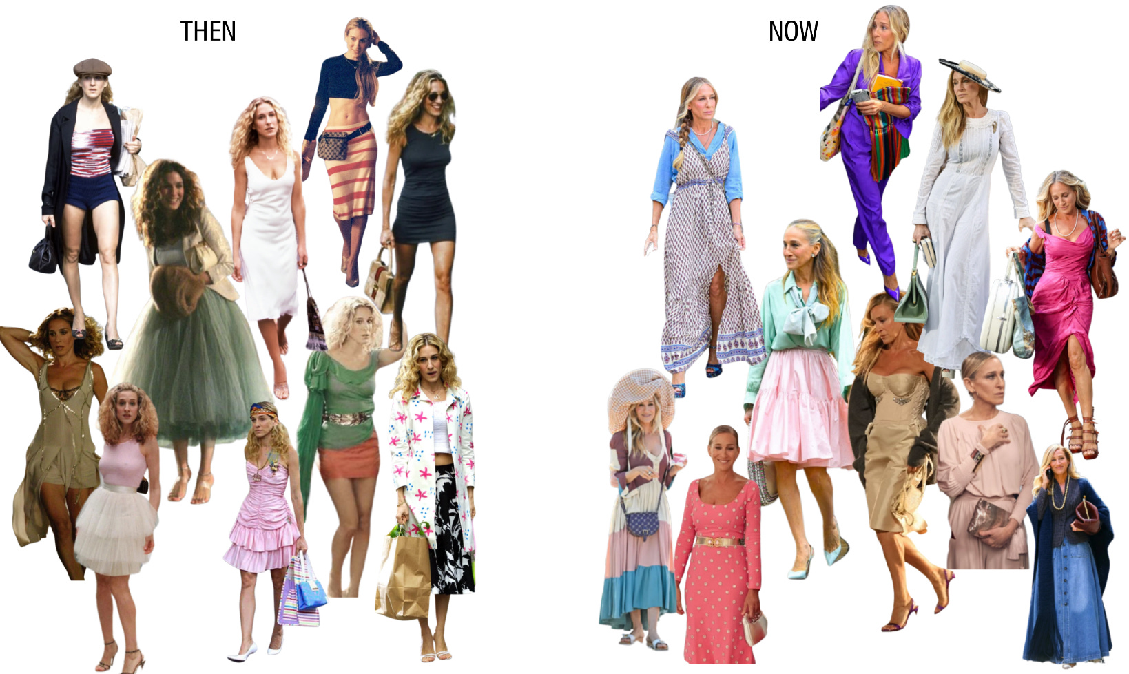 The early Carrie, she was given tremendous latitude to experiment. Her outfits conveyed she was deeply curious, opinionated, game for anything. And not ashamed to be figuring it all out, it’s part of life’s process. Each outfit communicated all of these things at once. But the “Now” Carrie became a bad copy of the former Carrie. A literal trope of what it looks like to have way to much funding to recreate exact replicas that never hit the mark. And they miss it because life moves on, the aim is not to recreate exactly what was but it’s in the thrill of figuring out how all that lived life plays in to who we are today. Our better understanding of how we show up as ourselves no matter the environment. Alas, that doesn’t mean a complete disregard to our surroundings. Carrie showing up to a farm to be with Aidan’s kids dressed in 5 inch platforms and satin no longer is about whimsy, it just seems weird she hasn’t figured out how to do “her” in varied situations that call for some - a bit- of understanding/recognition of the terrain/temp/vibe.
