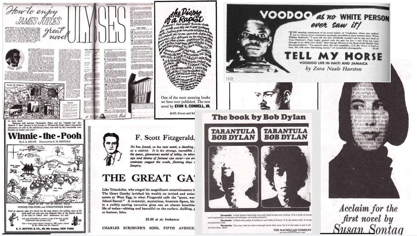 The balance between pushing the bounds to capture interest, while clearly communicating a message and purpose, is interesting to psychologically and emotionally unpack. Sometimes ads can be overwhelmingly bland with no character or message beyond the surface, and for me, it can be extremely frustrating when these types of ads come into my purview. Not only do I feel it represents a missed opportunity, but it also acts as a waste of space in my brain. Other times, seldomly now a days, I come across a beautiful ad that is inspiring and evokes emotion, forcing me to think and reconsider prior notions in my mind about a company or industry. These are the ads I want and welcome in my life. In the words of the great Don Draper, “You are the product. You feeling something. That’s what sells. Not them. Not sex. They can’t do what we do and they hate us for it.” When I’m building an ideation deck, it helps to explore the more obvious places first - it’s like being an inspiration detective, you start with the more usual suspects to see if anything is there, so I went deep into my references to find examples from the literary world and they struck me in a good way. I looked at old newspaper ads for popular books that had immense impact on our culture by authors like Toni Morrison, F. Scott Fitzgerald, and Susan Sontag.