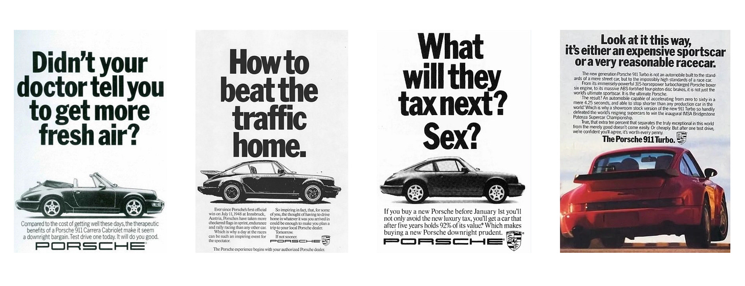 Porsche is my favorite automobile company - they exude elegance, sport, and luxury through an effortless blend of modernity and heritage. Considering the adjectives I associate with Porsche, their ads from the late 20th century become even more intriguing. A fusion of bold faced graphics, a short and pointed catch phrase, accompanied by a few sentences of comical and relatable copy that projects confidence in their product and defines their value proposition, ended succinctly by stating that you’ll be happy you gave it a chance. There is no pandering or wasted space, an appeal to all with a sense of humor, solidifying the loyalty of their aspirational customer while furthering that of their target market.