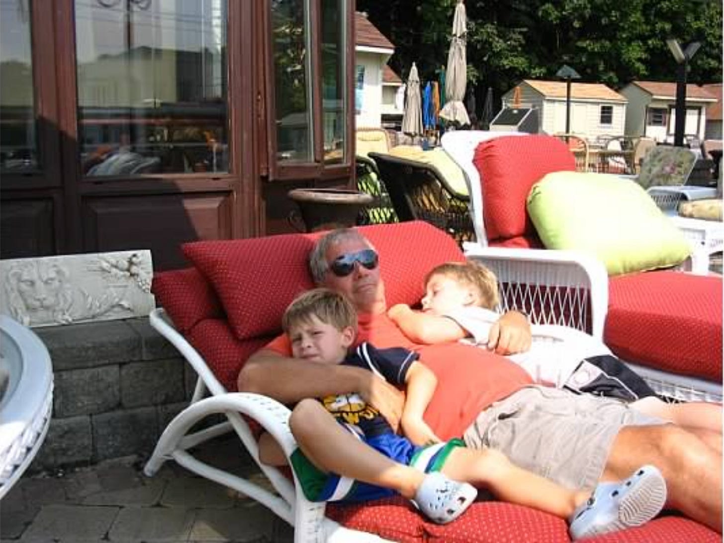 Fully content, my dad chilling with the boys on the side of a busy street in a lot filled with patio chairs for sale. This wasn’t something that occurred because they were shopping for chairs, this was the intent of the visit. Charlie looks annoyed here, but only because his grandmother is asking him to smile.