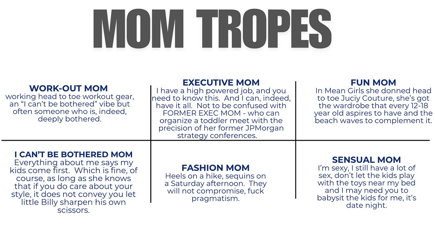 First, I’m going to layout the Mom tropes. And here’s the thing, while it is funny to laugh at the tropes, reality is that in some way we all want to be a little bit of each of them. Just not to the point that it’s so easily encapsulated here.