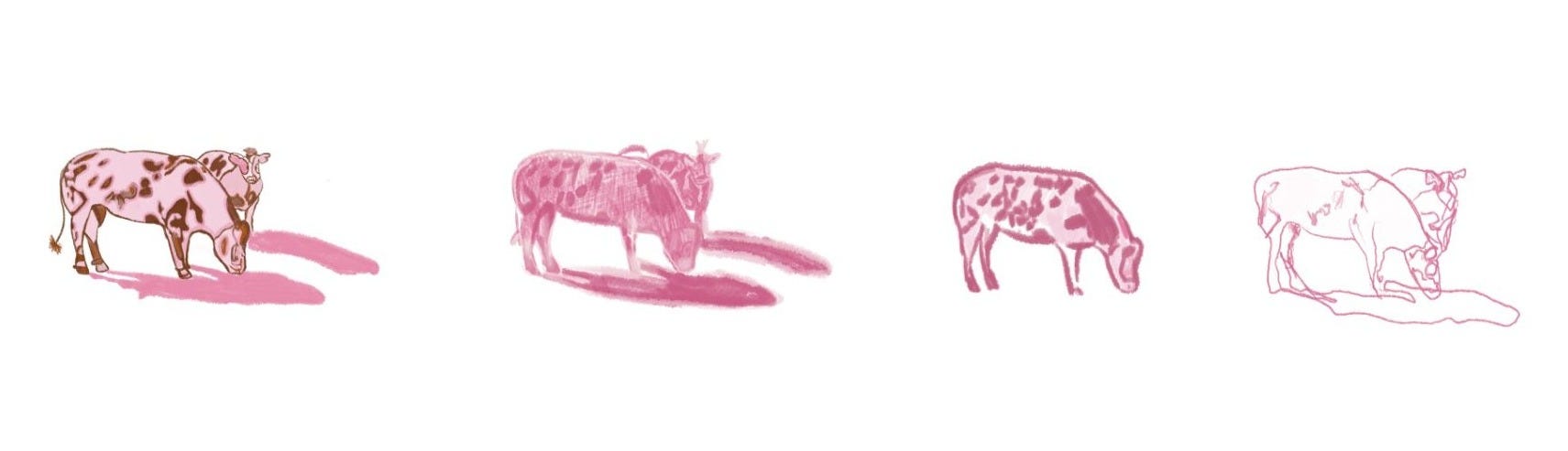 For our second shirt, we wanted to do something different from the Supper-T. What exactly that meant, we were quite unsure, but I knew that we wanted an element of creativity, by hand, that went further than our previous project. So, with that in mind, we printed out the cow image onto 24x16 matte paper. We found a range of beautiful colours from Farrow & Ball, and began to paint on top of the printed image. It wasn’t quite what we wanted, so we printed it again, and painted again. This time we were getting closer, but still not there yet. We took a photo of the printed, painted image, and began to draw over the image. Initial sketches were more refined.