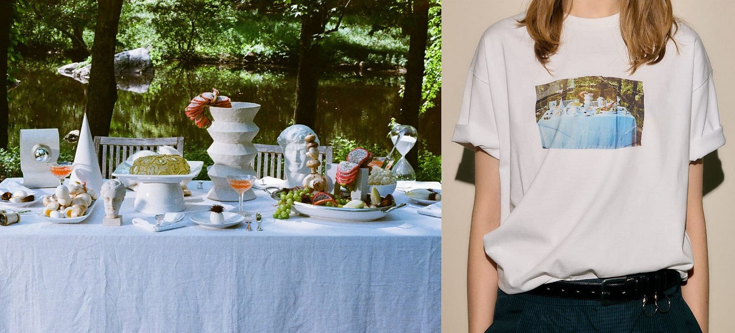 The TCL tees are time capsules, memorable moments and memories from our Tibi trips, shoots, and campaigns. Our first tee, “The Supper Tee”, was a printed film photo, a photo of that photo after wrinkling it by hand - a souvenir from our Resort 2025 campaign shoot in the woods of Greenwich, CT.