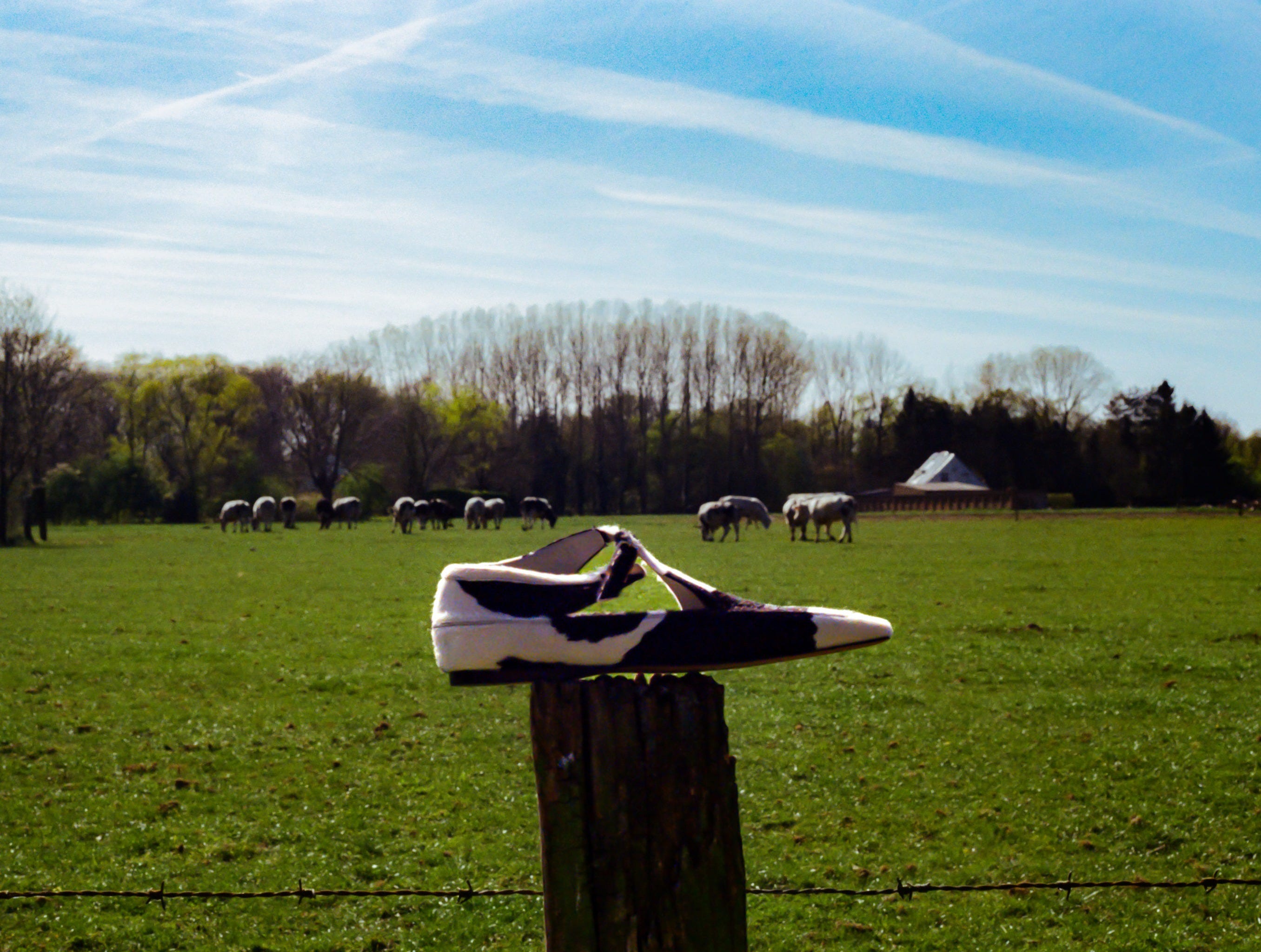 During our break for lunch, I wandered off to a neighboring field where I discovered a herd of beautiful Belgian cows. I raced back to the castle to grab my camera, and our new Herbert Loafer and Somerset Flat, to capture the calm and happy creatures, and to shoot some impromptu still life of the pony hair printed shoe that would launch with our Fall ’25 Collection. Little did I know in that moment that these still-lifes would be repurposed down the line as editorials for marketing the shoes, nor that we would use the Belgian Blue cows as the inspiration for a TCL tee.