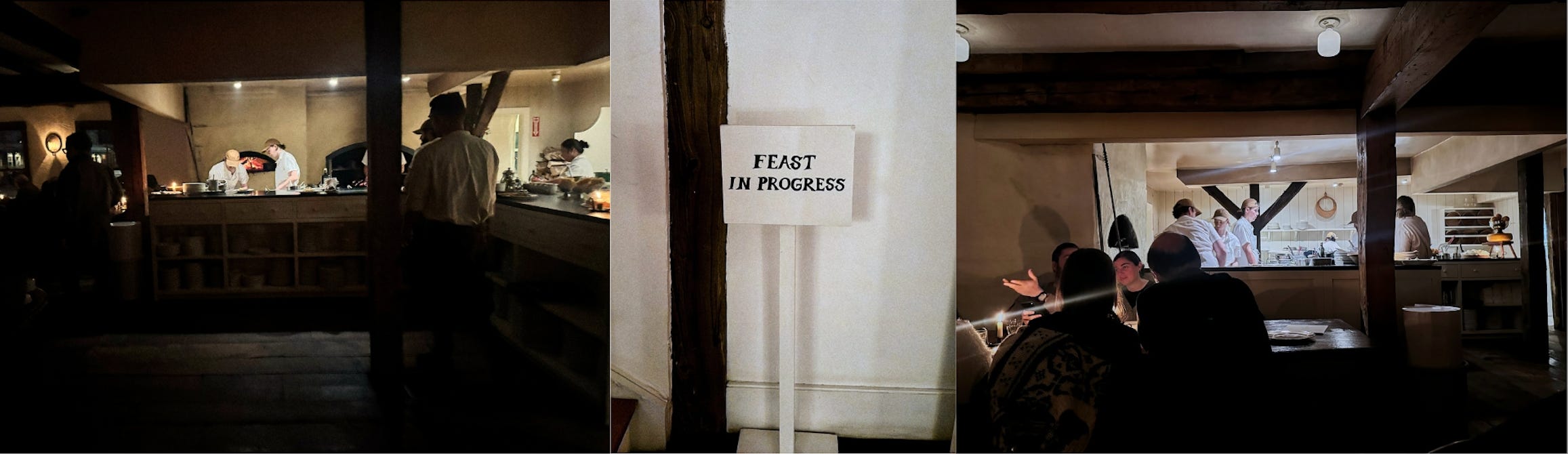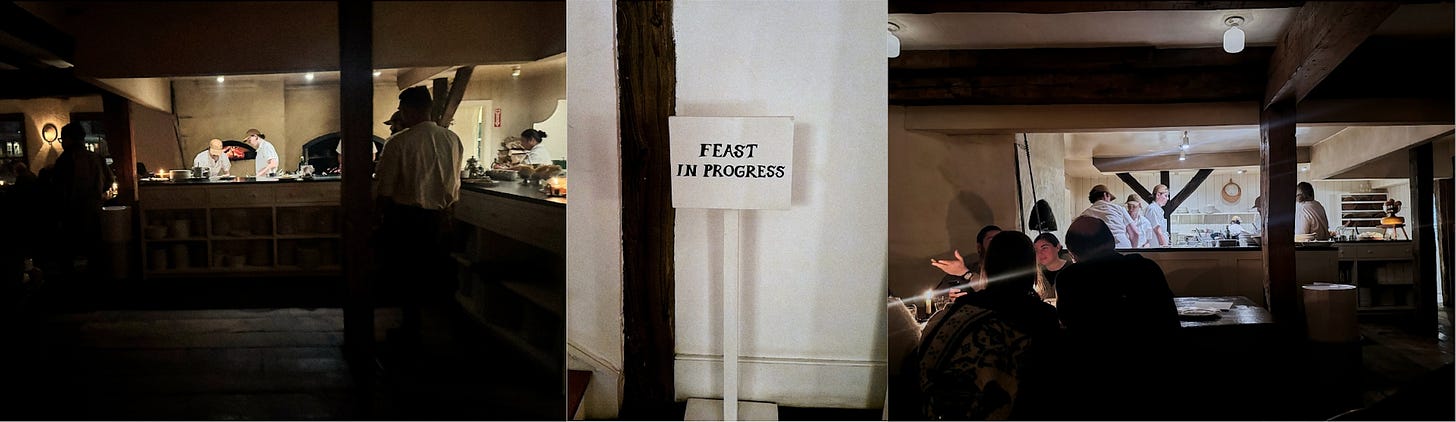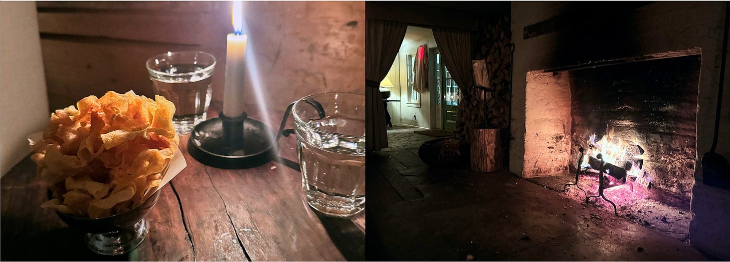Our reservation was at 8:30 p.m., but we planned for a 30-minute buffer to enjoy a glass of wine and monkey nuts in The Woodshed. An escape from the city to immerse ourselves in a setting where waiting is no longer a stressful, anxiety inducing burden, but instead a craved and privileged luxury. As peanut shells are tossed into the crackling fire, its sound possessing a natural, effervescently rhythmic quality, guests settle into this cabin-like den by nestling into a unique variety of Bergère chairs with card games a plenty. I would be remiss not to note that the fireplace is ordained with Roseland iron tools, hand-forged made in Maine - a furniture concept that was started in 2023 by none other than Chef Clare and her husband, Luke. At 8:30 p.m., a hostess promptly enters to call our name and gently whisk us away to our table in the center of the dining room - wooden Windsor Chairs, by Roseland of course, locally sourced tableware, textiles, and ceramics, all contributing in both conscious, and subconscious ways to the deeply inspired and warm ambiance.
