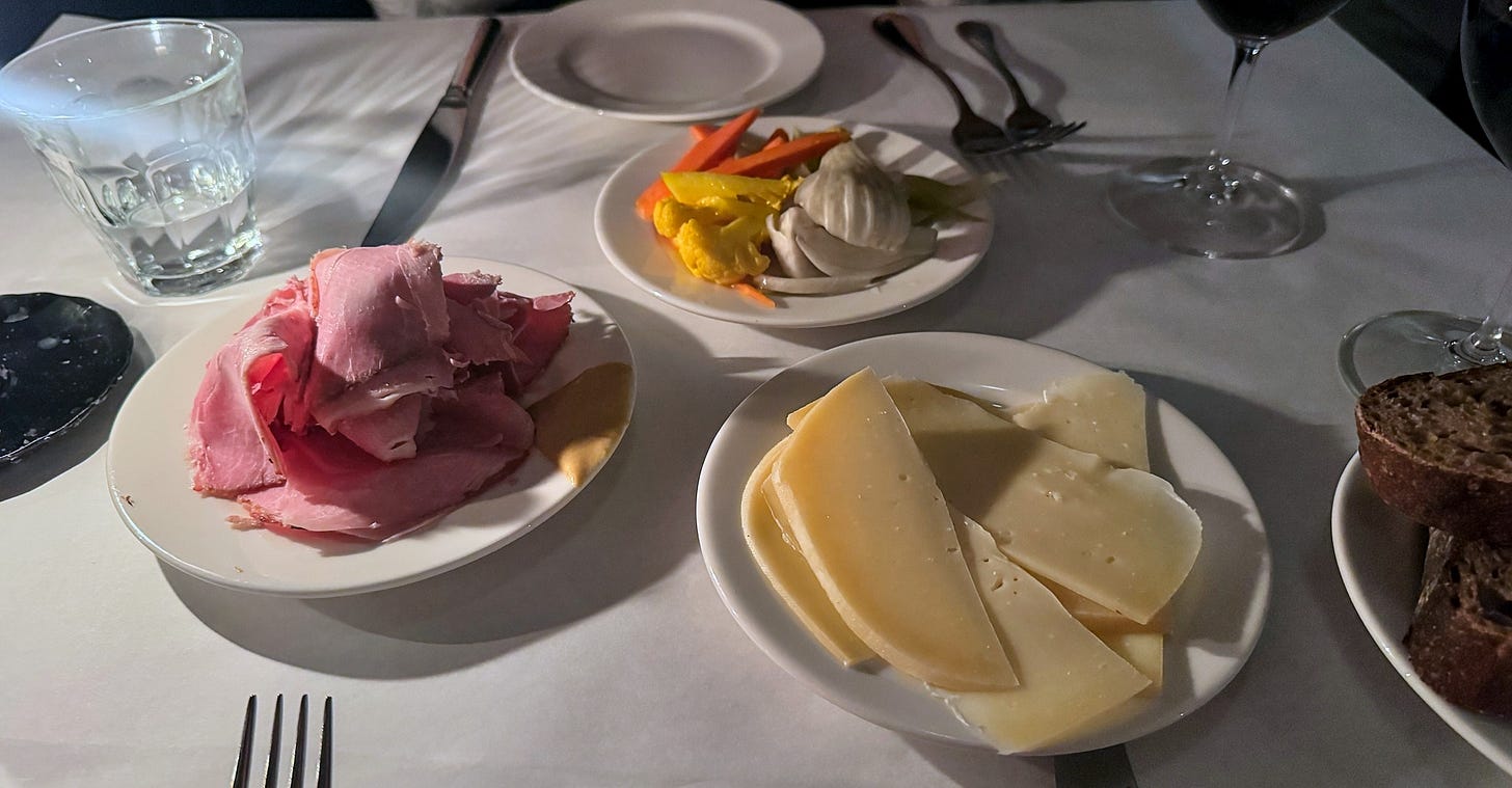 To start the meal: Ham, Jakes Gouda, and Pickles. This, as a wise soul once said, is the holy trinity of light bites. Jakes Gouda carved straight from the wheel, crystals and all, thinly sliced thick ham with a dot of punchy mustard (a love-tap, if you will), and an assortment of winter vegetables - celery, carrot, endive, and cauliflower - ever so slightly pickled so as to add a tinge of newness to each item while supporting their solo flavor stardom. The three, when eaten together, provide for a simply divine experience.