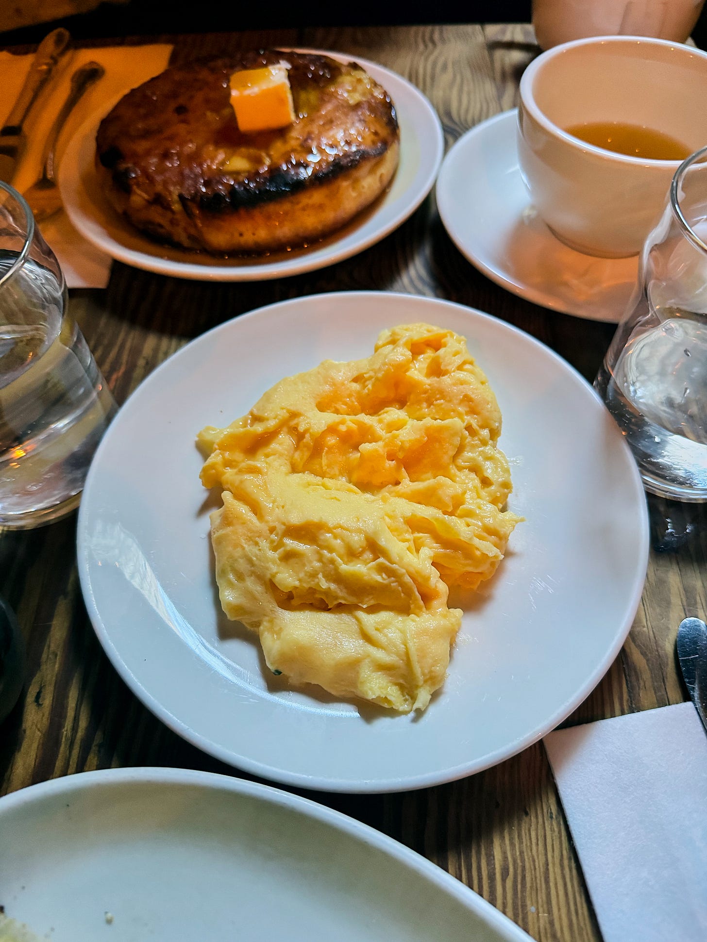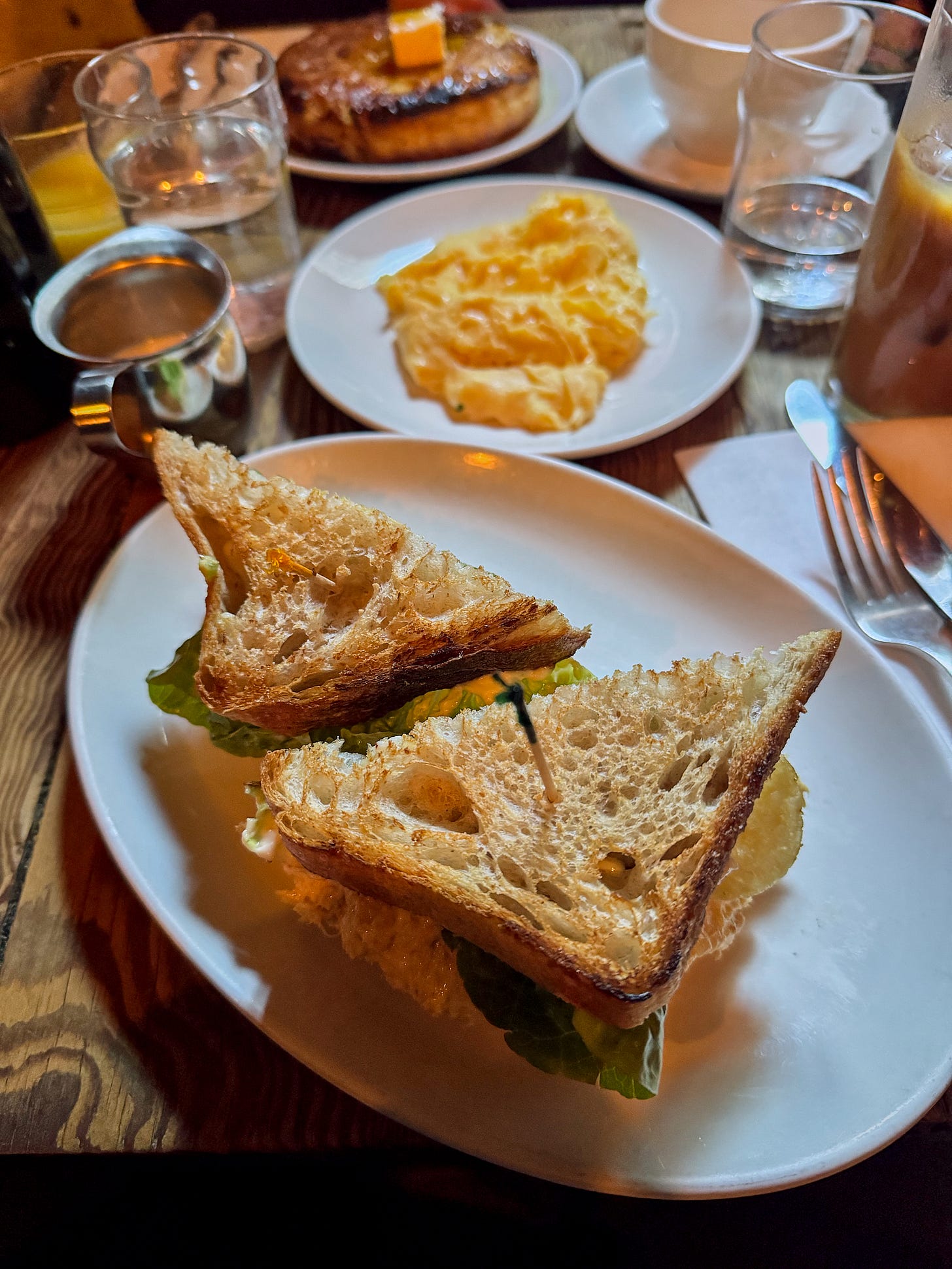 The menu is short in the way that menus are so when the kitchen is confident enough not to overextend. Our picks included some orange juice, cold and clean - uncomplicated in the way that only fresh-squeezed juice can be, which is to say completely. Then a mint tea that carried the particular quiet authority of something that does not need to announce itself: a small ceramic cup, steam rising slowly into the dim warmth of the downstairs room, each sip less like refreshment than permission - to stop moving, to settle in, to be somewhere on purpose on a cold weekend morning.