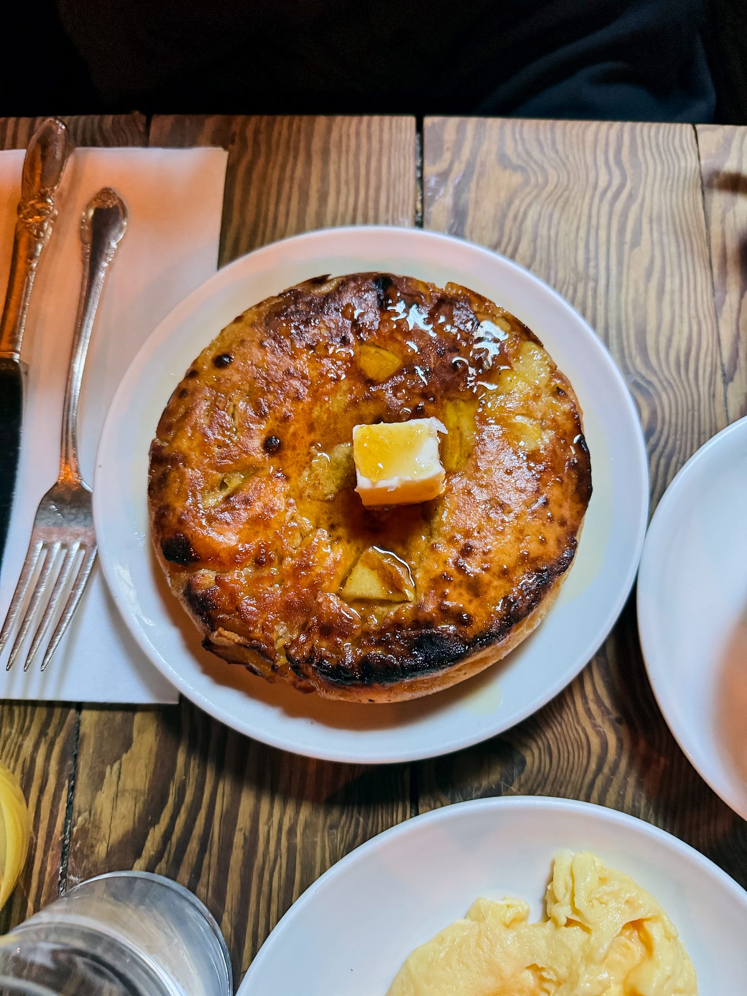 The food itself unfolded less like a sequence of dishes and more like a single, sustained argument for staying longer than you planned. The Apple Sourdough Pancake led - one round, cast-iron-caramelized disc, its exterior somewhere between amber and lacquer, giving way inside to the softness of a sourdough crumb that has been offered time, heat, and ingenuity behind its creation. Upon reaching the table, pat of butter was already melting into its center as maple syrup pooled around the base - a picturesque invitation to taste the faint tang of fermentation the pulls quietly beneath the sweetness. These were not opposing forces, the tang and sweet, but a foundation. It is the kind of thing that makes you understand, viscerally, what a wood-fired oven is actually for, and why no other method of cooking would produce the same result. If you go and order nothing else, order this.