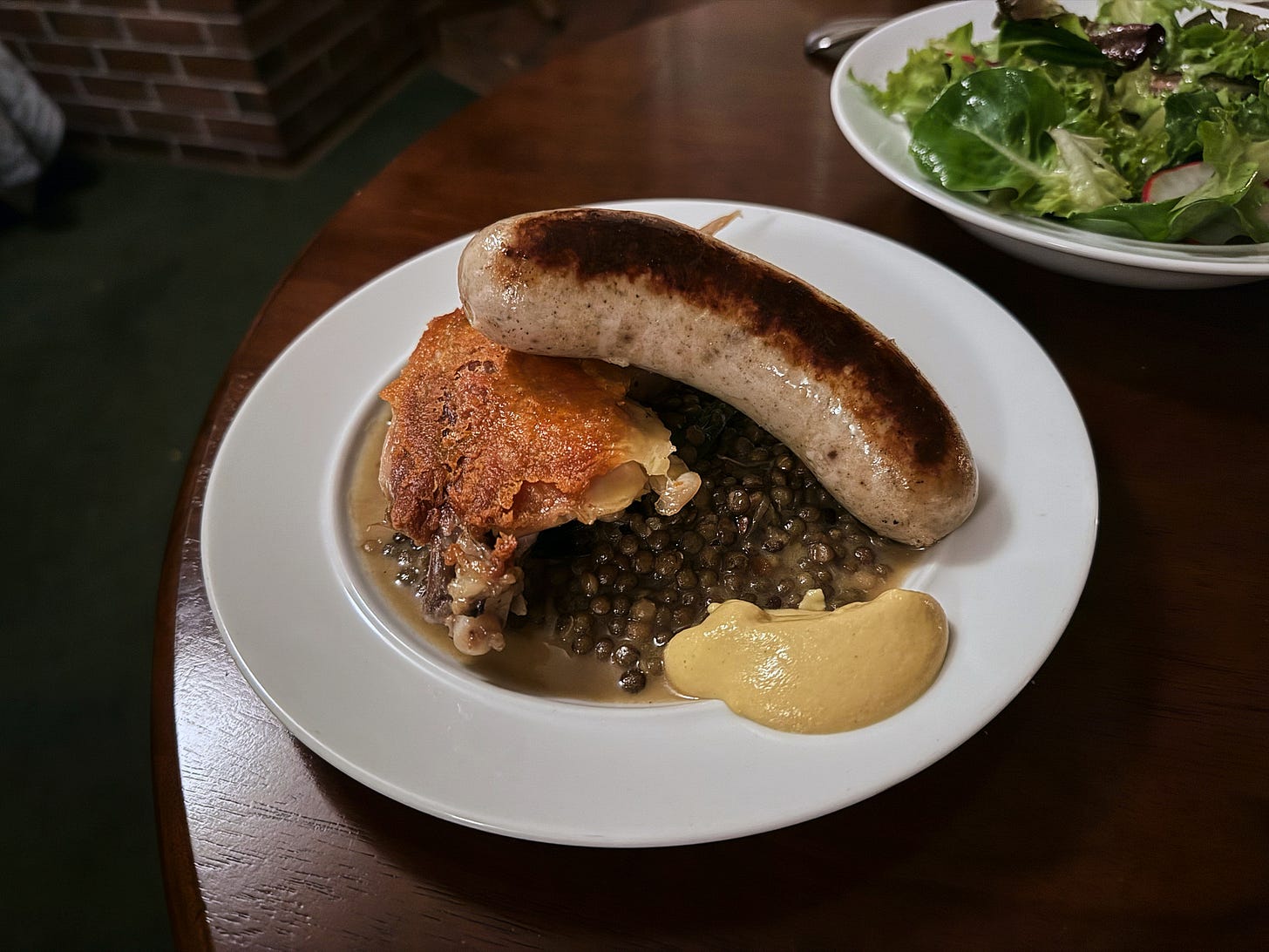 And finally, we were greeted by the Poulet Rouge & Boudin Blanc, Ramps, the dish upon which the two burners in the back corner of the kitchen make their fullest argument. A pale boudin blanc, pan-seared to a golden skin with the kind of gentle snap that tells you the interior was made with care, curved over a pool of lentils that had absorbed the deep and patient jus upon which sat a piece of poulet rouge, its skin crisped to the russet color that only a heritage bird achieves, the fat having done exactly what it was supposed to. A streak of mustard on the side, an invitation rather than a directive. The whole thing landed on the table with the assurance of something that did not require explanation, and we did not offer any - just ate it, in the quiet way you eat food that has earned your full attention without asking for it.