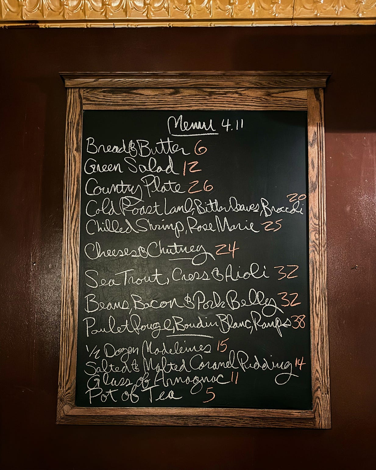 We were there on a Saturday evening in April. The room filled in the way a 40-seat pub fills - not crowded, but dense with warmth, every stool at the long oak bar occupied, conversations layering over the low crackle of the record player. Pints of Guinness and glasses of Scotch catch and absorb the amber light of the tin ceiling above as Mester himself is stationed at the end of the bar, moving with the deliberate calm of a man who has made his peace with exactly where he is. The chalkboard menu reads like a letter from somewhere in the pastoral British Isles: twelve dishes in chalk — Country Plate, Cold Roast Lamb with Bitter Leaves & Broccoli, Poulet Rouge & Boudin Blanc with Ramps, ½ Dozen Madeleines — written in a hand casual enough to suggest they might change before the night was out.