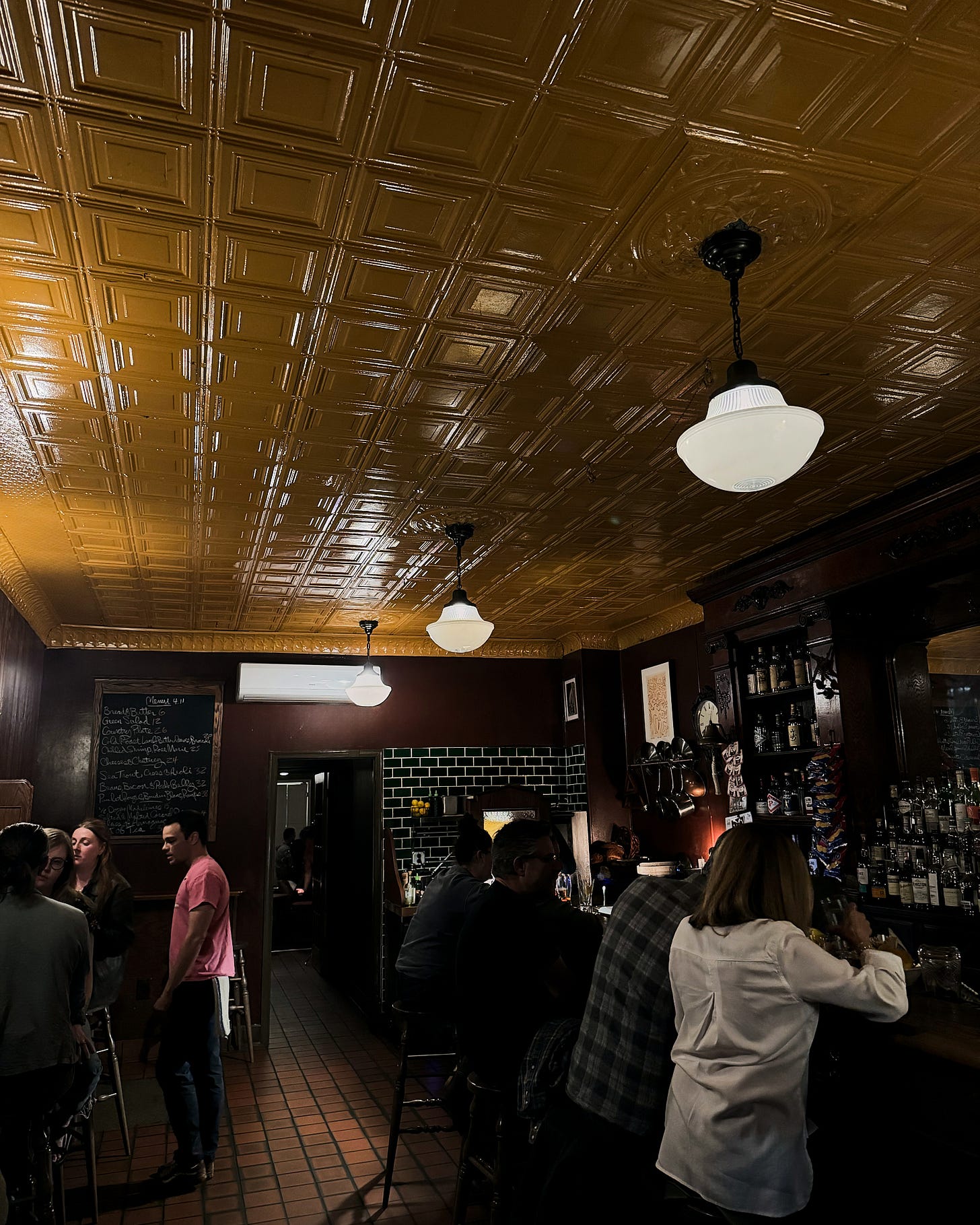The building helped make the decision. 1712 Aliceanna Street is a circa-1890 rowhouse in Fells Point that had spent 44 years as Birds of a Feather, a beloved hole-in-the-wall Scotch bar with a devoted local following. When its owner retired, Mester and his partners bought it with a commitment that seemed both obvious and, in a neighborhood that has lost more than a few of its defining places to gutting and reinvention, genuinely rare: to leave it mostly alone. The original 19th-century wooden bar remains. The pressed tin ceiling — amber-hued, extraordinary — remains. The terracotta tile floor, the oak millwork, the back-lounge fireplace. What changed is relatively minor, and deliberately so.