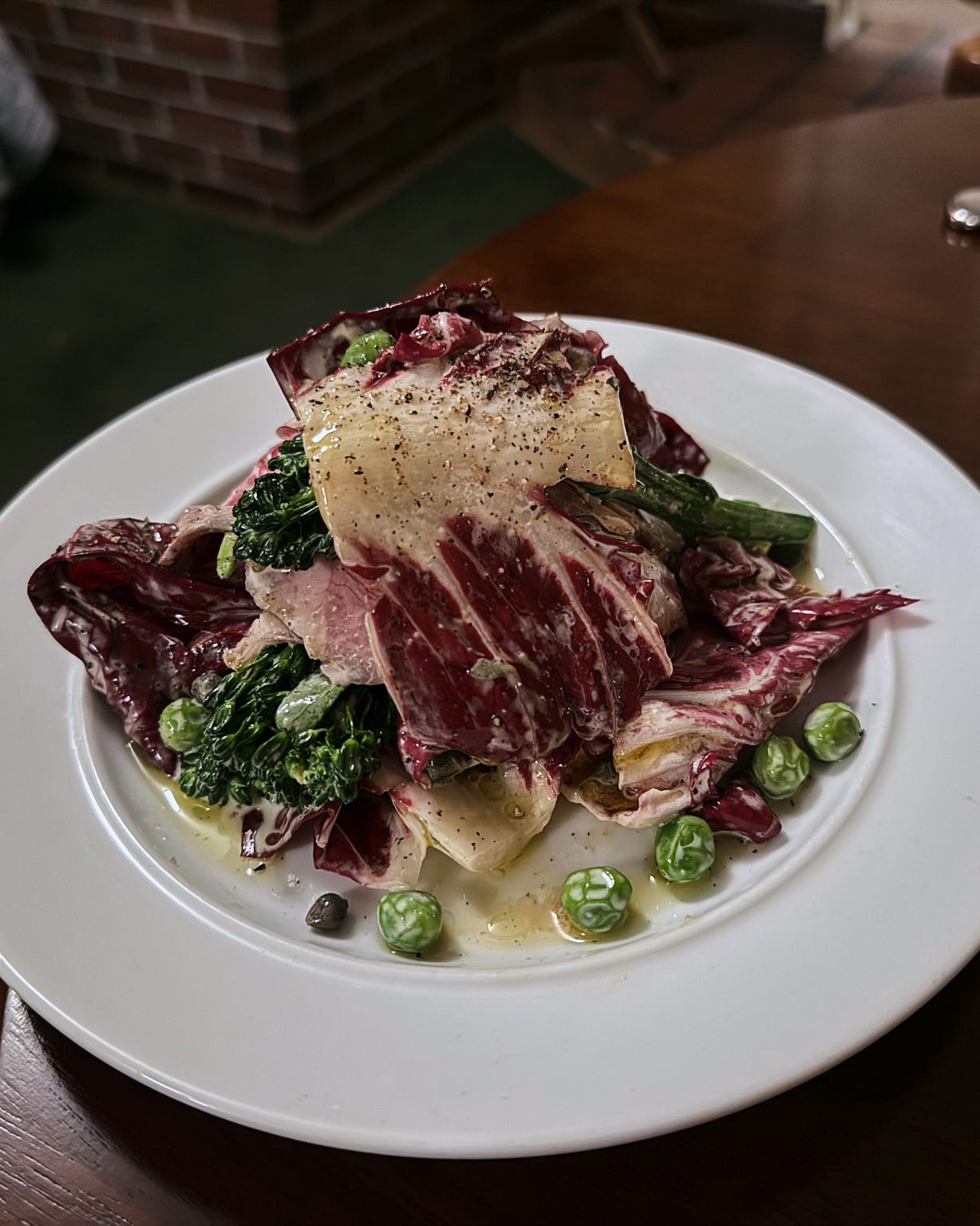 The Cold Roast Lamb, Bitter Leaves & Broccoli moved the table to a different register entirely. Radicchio and broccolini arranged with quiet authority above broad slices of beautifully pale, cold roast lamb, adorned with peas and capers, and a creamy dressing to pull everything together. The bitterness of the radicchio against the richness of the dressing, the lamb cool and yielding, the capers offering the occasional sharp punctuation. This dish was emblematic of the specific discipline that is the execution of cold food, done with intention, and requirings as much confidence as it does technique. This plate had both.
