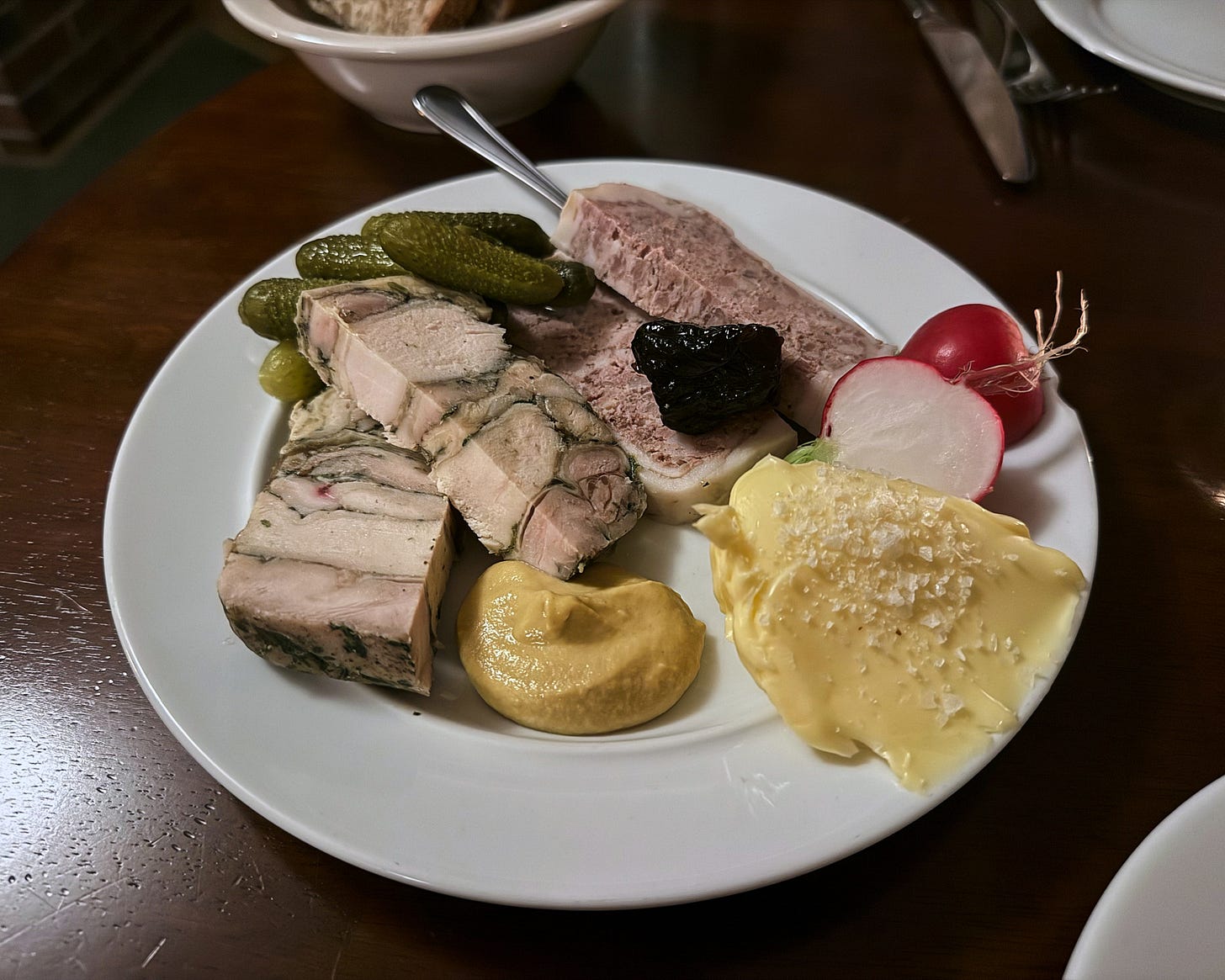 The Country Plate set the agenda for everything that followed. A white plate bearing a slice of an herb-studded, chicken terrine - tightly packed, a cross-section embodying patient work done earlier in the day - alongside something richer and closer to headcheese, a generous mound of butter dusted with fleur de sel, cornichons tumbled alongside, a dried prune, two radishes, a pool of grainy mustard. Nothing on the plate announced itself. It sat there asking to be eaten slowly, with bread, with conversation, with whatever was in the glass, in whatever order seemed right - and this is precisely the quality that separates great pub food from its approximation. Not the sophistication of the ingredients, though the ingredients here are sourced with genuine care, but the total absence of anxiety about how the food is received.